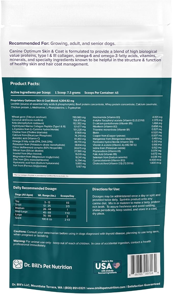 Dr. Bill's Canine Optimum Skin & Coat – Reduces Shedding, Itching, Dry Skin – Allergy Relief for Healthy Fur - Omega 3, Collagen, Biotin & Hyaluronic Acid – 340g Vet-Recommended Dog Supplement
