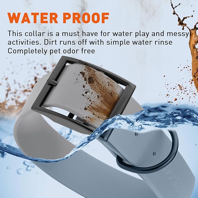• Free Your Dog to romp in puddles and retrieve from lakes with the Dogline Biothane Waterproof Dog Collar. This water-repellent collar stays dry and odor-free, without shrinking or losing flexibility.