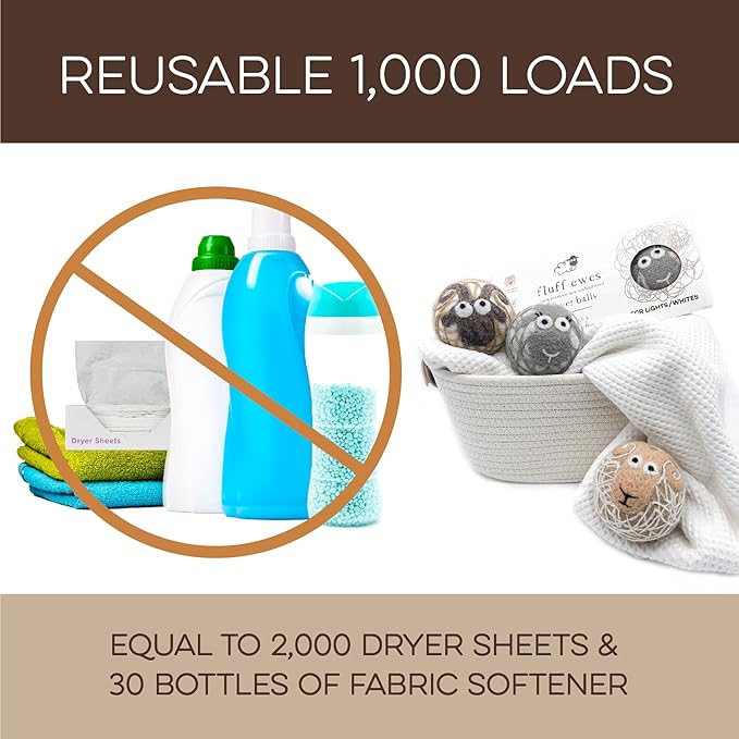 - REUSABLE FOR 1000+ LOADS β REDUCE WASTE: Why keep buying disposable dryer sheets? These cute dryer balls last 1000+ loads, replacing 2000 dryer sheets or 30 bottles of fabric softener. Fluff Ewes dryer wool balls laundry reusable deliver a cost-effective solution for 2-4 years of hassle-free laundry. Make a smarter choice for your wallet and the environment.