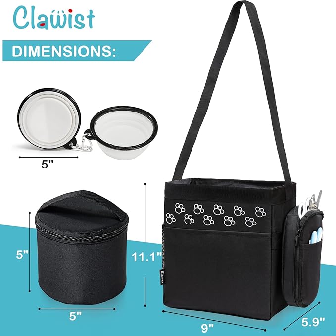 - DURABLE AND STYLISH - Clawist dog travel bag Made with premium materials, this travel organizer kit for pets holds all your fur babyโs essentials: dog food, treats, a water bottle, toys, and other dog travel accessories