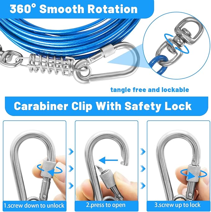 - THE NEWTEST CLIP: The rotating clip can rotate 360 Β°, and the clip is fixed with a ring at the bottom,so that the dog leash will not fall off the hook easily. Provide more space for dogs to move without entanglement. The screw on the swivel hook can lock it to prevent your pet from escaping from the cable and running to dangerous places. pet from breaking free of the cable and running into harm's way.