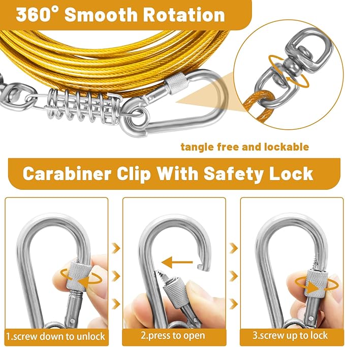 - THE NEWTEST CLIP: The rotating clip can rotate 360 Β°, and the clip is fixed with a ring at the bottom,so that the dog leash will not fall off the hook easily. Provide more space for dogs to move without entanglement. The screw on the swivel hook can lock it to prevent your pet from escaping from the cable and running to dangerous places. pet from breaking free of the cable and running into harm's way.