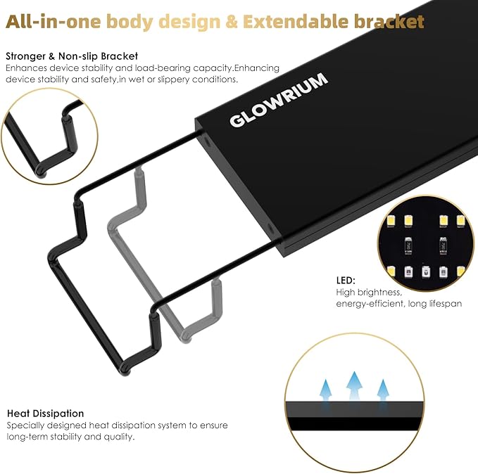 - All-in-One Body with Extendable Bracket: The aluminum all-in-one body design enhances heat dissipation efficiency and stability, offering a sleek and lightweight appearance for easy installation. Its extendable bracket easily fits most 36-inch to 41-inch aquariums, making it user-friendly for both beginners and experienced enthusiasts, ensuring straightforward installation and operation.
