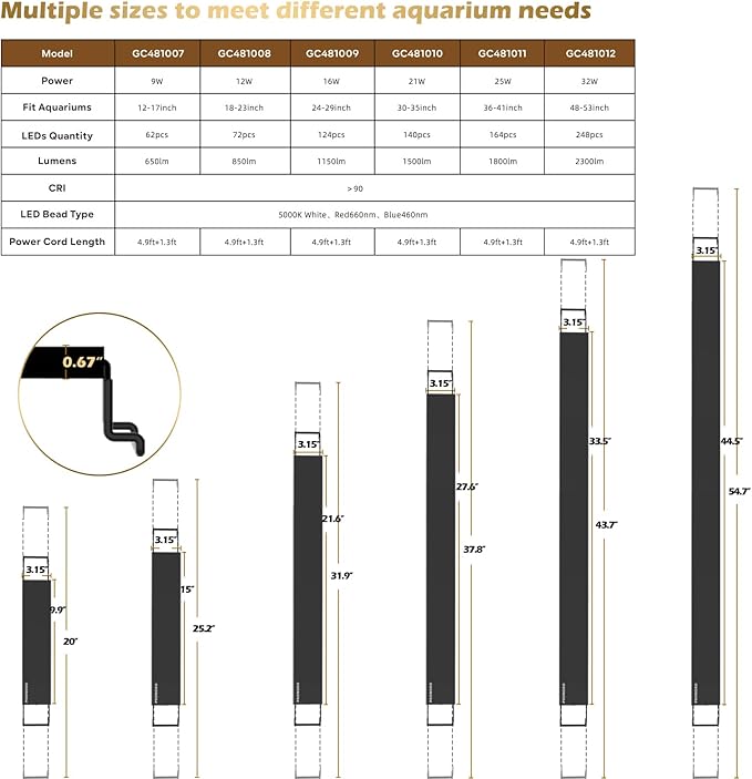 - All-in-One Body with Extendable Bracket: The aluminum all-in-one body design enhances heat dissipation efficiency and stability, offering a sleek and lightweight appearance for easy installation. Its extendable bracket easily fits most 36-inch to 41-inch aquariums, making it user-friendly for both beginners and experienced enthusiasts, ensuring straightforward installation and operation.