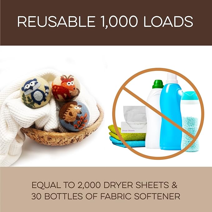 - REUSABLE FOR 1000+ LOADS β REDUCE WASTE: Why keep buying disposable dryer sheets? These cute dryer balls last 1000+ loads, replacing 2000 dryer sheets or 30 bottles of fabric softener. Fluff Ewes dryer wool balls laundry reusable deliver a cost-effective solution for 2-4 years of hassle-free laundry. Make a smarter choice for your wallet and the environment.