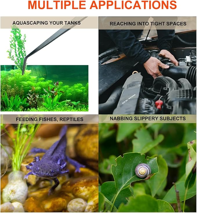 - WIDELY APPLICATION: You can use our tweezer tongs in different situations as moving staff around your tank, adding the taking away things, reaching into tight spaces, removing the tooth brush from drain, aquascaping your tank, nabbing slippery subjects, feeding aggressive fish, reptiles, exolot, turtle, snake, etc.