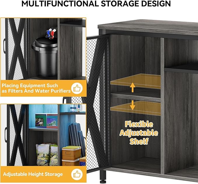 - Orderly storage: This fish tank with stand easily keeps everything organized. The built-in cabinet stores fish food, cleaning tools, and other accessories while the adjustable shelves help accommodaΒ·Β·Β·te items of various sizes
