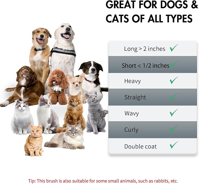 - Versatile Compatibility: Suitable for all breeds and sizes, big and small. our self-cleaning brush effectively tackles both long and short hair types. Its versatile design works wonders on smooth, curly, thick, heavy and silky coats, making grooming a breeze for pet owners and groomers alike.