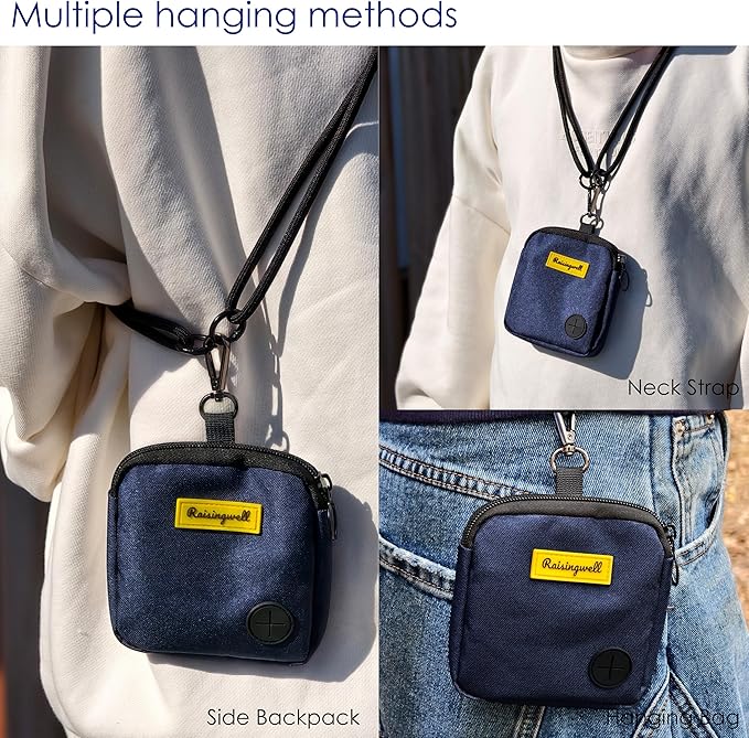 - Raisingwell Dog T1ใFashion Design: This dog training treat bag measures 4.9 x 5.1 inches and offers versatile wearing options. It comes equipped with a carabiner and a strap, allowing you to hang it on your leash, attach it to your pet's collar, or even wear it as a trendy accessory on your bag. The bag features a zipper closure, ensuring that treats stay secure inside even when you're playing with your pet afterward. It's perfect for carrying around or using during short outings.reat Pouch