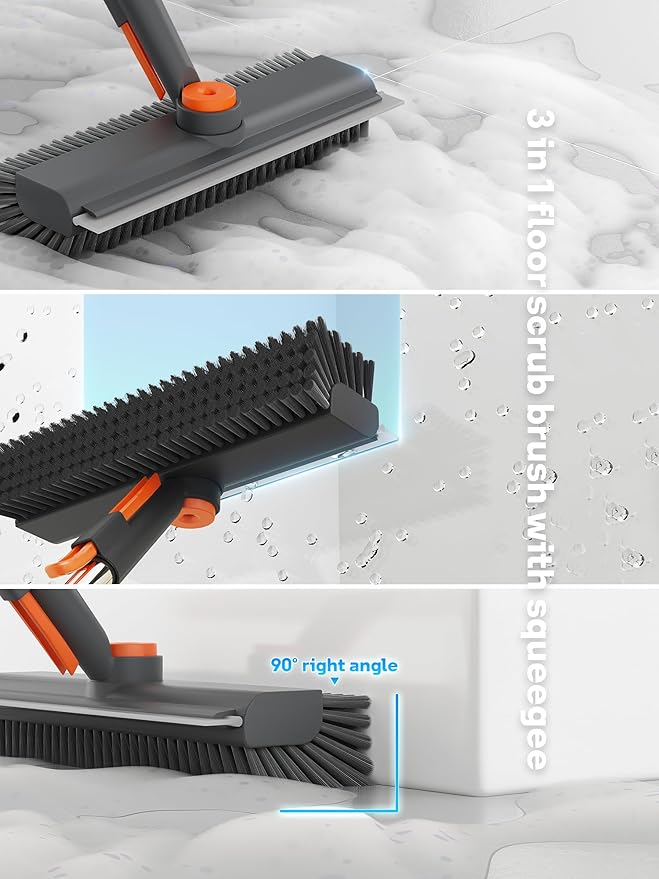 - 【Multi-Angle Adjustable Scrub Broom】: The brush head of our scrub brush with long handle can rotate(press the button) to multiple angles, giving you complete control over your cleaning. Whether you’re cleaning floors, walls, or corners, ensures you can tackle every spot comfortably and thoroughly