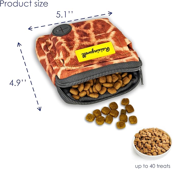 - Raisingwell Dog T1ใFashion Design: This dog training treat bag measures 4.9 x 5.1 inches and offers versatile wearing options. It comes equipped with a carabiner and a strap, allowing you to hang it on your leash, attach it to your pet's collar, or even wear it as a trendy accessory on your bag. The bag features a zipper closure, ensuring that treats stay secure inside even when you're playing with your pet afterward. It's perfect for carrying around or using during short outings.reat Pouch