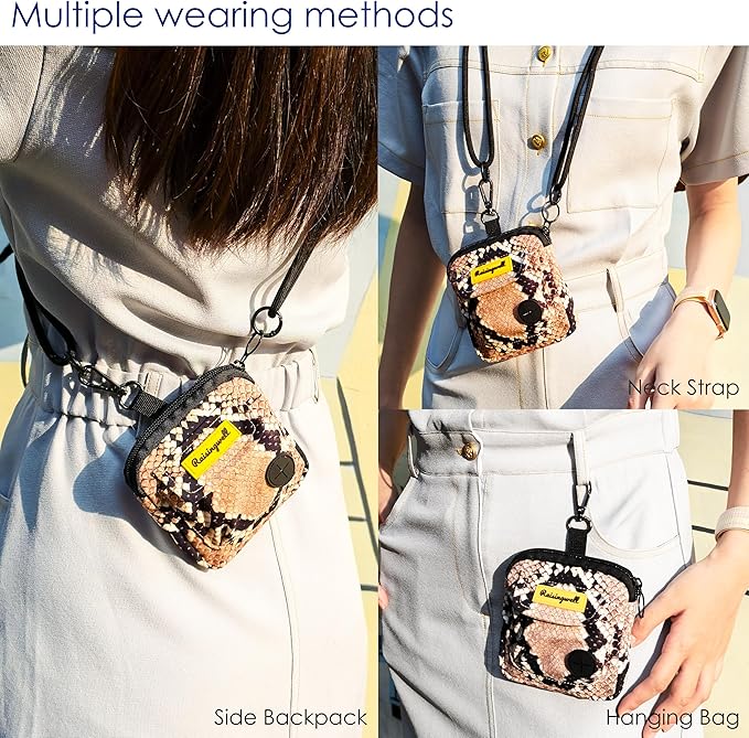 - Raisingwell Dog T1ใFashion Design: This dog training treat bag measures 4.9 x 5.1 inches and offers versatile wearing options. It comes equipped with a carabiner and a strap, allowing you to hang it on your leash, attach it to your pet's collar, or even wear it as a trendy accessory on your bag. The bag features a zipper closure, ensuring that treats stay secure inside even when you're playing with your pet afterward. It's perfect for carrying around or using during short outings.reat Pouch
