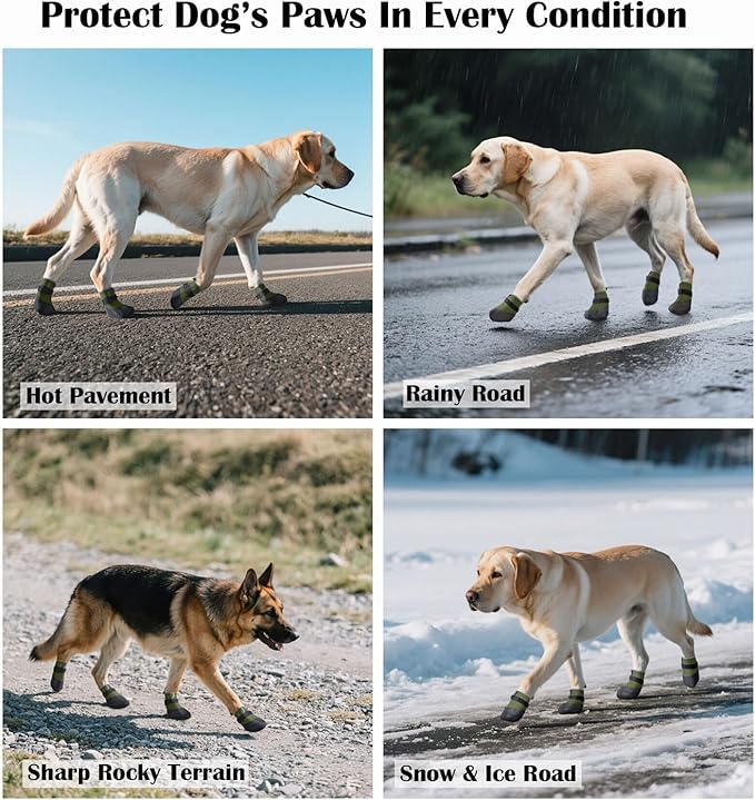 - [All-Weather Paw Protection]: Whether youβre navigating slippery floors, hot pavement, snowy trails, or rocky paths, our dog boots have you covered. The high-visibility reflective edges ensure safety during nighttime walks, making sure your furry friend stands out!