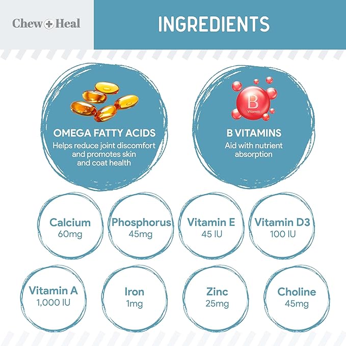 - Chew + Heal's dog multivitamin is a powder supplement packed with vitamins, minerals, and probiotics to help your dog feel his best, whether he's a puppy or a senior dog.