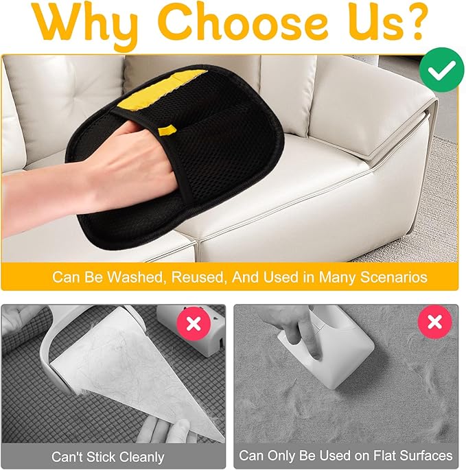 - Reusable: electrostatic pet hair remover glove,Say goodbye to wasteful sticky papers and lint rollers! This pet hair removal mitt is washable and reusable, making it a sustainable choice that saves money and reduces environmental impact. Simply rinse it with water or throw it in the washing machine after a thorough clean