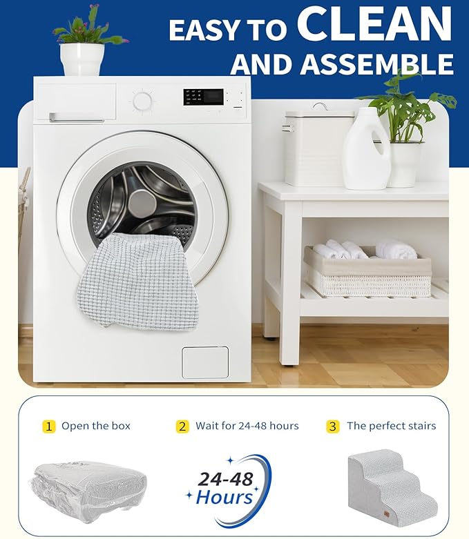 - Easy to Clean - The dog stairs feature a removable, machine washable cover for effortless cleaning. Using without assemble, our pet stairs provide a safe and convenient way for your furry friend to access higher surfaces without the risk of injury or strain on their joints