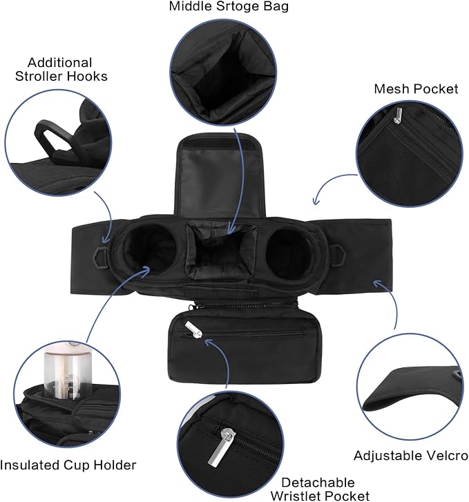 - Multifunctional storage spaceοΌDog stroller caddy organizer is equipped with 6 dedicated compartments, which can respectively store water bottles, snacks, toys, leash, and filled and empty poop bags. The items are clearly categorized and easily identifiable. An poop bag dispenser is included to ensure you are always prepared and can easily handle various needs during the dog walking process.